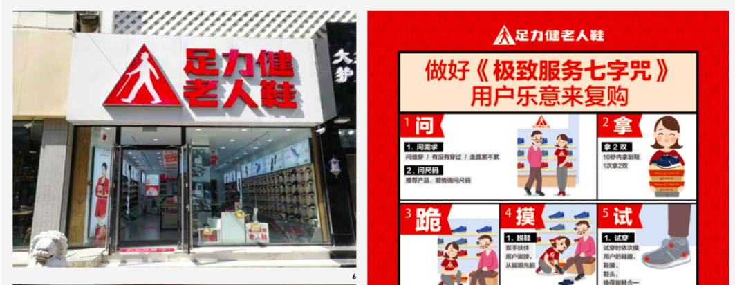 Due to elderlies' declining physical condition, actions like trying on shoes can be challenging for some of them. The conventional service model cannot fully meet the needs of the elderly. To provide more caring and professional service to the elderly, Hua & Hua designed the "Seven Characters of Ultimate Service": Ask, Fetch, Kneel, Touch, Try, Buy, Deliver. This helps Zulijian establish a standardized service system. Later, based on the content of the 7 services, Hua & Hua created a song for the "Seven Characters of Ultimate Service," making it even more memorable and practical. This not only serves as a service guide but also becomes an important sales prop for the stores.