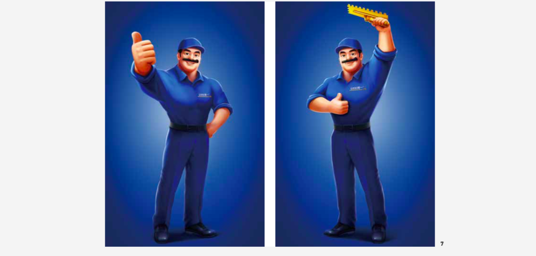 In GANI's finished product delivery service system, there is a crucial role for the tile worker. GANI has its own team of skilled tile workers, which provides a differentiated value in the service system. Hua & Hua designed a super character for GANI: a Tile Master with a moustache to play the dramatic GANI brand role.